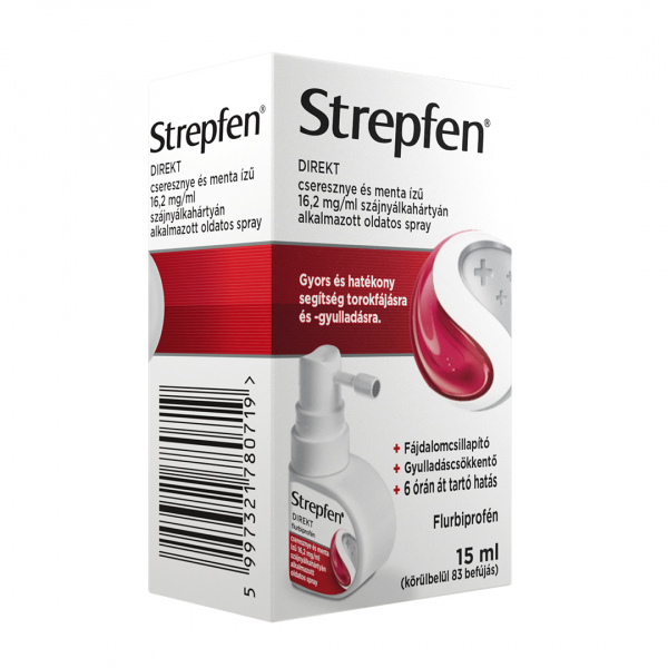 A Strefen DIREKT a torokgyulladás tüneteinek, például a torokfájásnak, a fájdalomnak, a nyelési nehézségnek és duzzanatnak a rövid távú kezelésére szolgál. A készítmény hatóanyaga a flurbiprofén. A flurbiprofén az úgynevezett nem szteroid gyulladáscsökkentő készítmények (NSAID-ok) csoportjába tartozik. Ezek a gyógyszerek a szervezetnek a fájdalomra, a duzzanatokra és lázra adott reakciójának megváltoztatásával biztosítanak enyhülést.